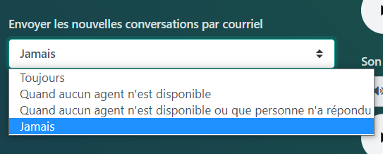 À l’aide du menu déroulant « Envoyer les nouvelles conversations par courriel », vous pouvez choisir les options suivantes: