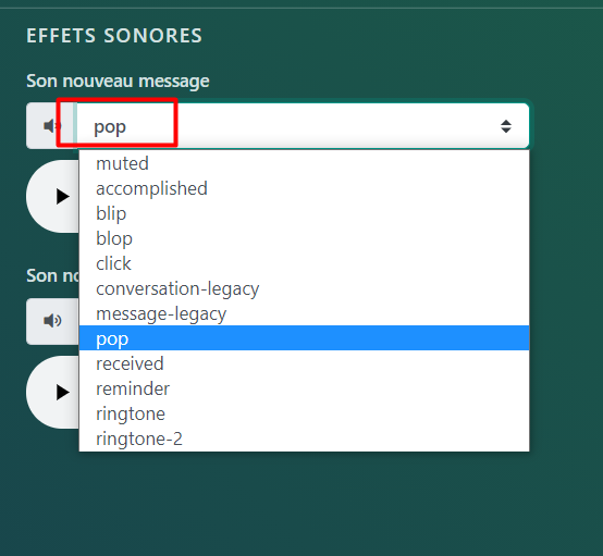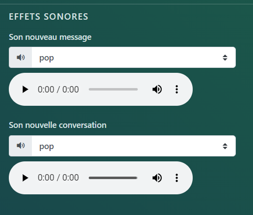 Pour les paramètres d’effets sonores, vous pouvez ajuster l’effet sonore produit lorsque vous recevez un nouveau message et lorsqu’un client démarre une nouvelle conversation: