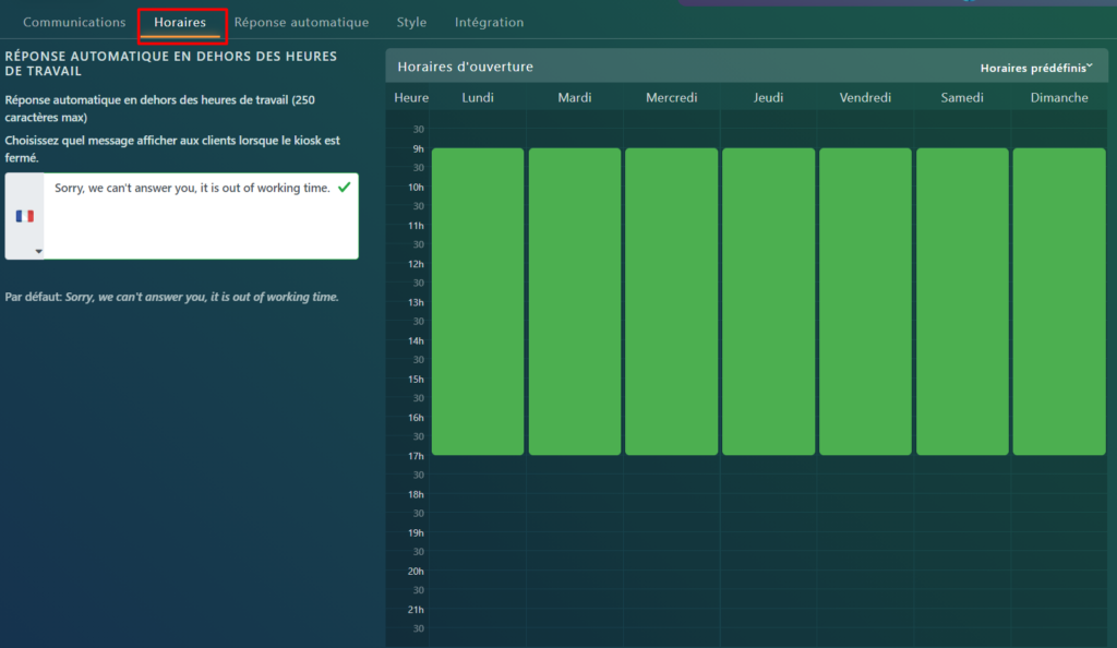 Sélectionnez l’onglet Horaires dans les paramètres de chat. Vous pouvez modifier la réponse automatique en dehors de vos heures de travail et définir vos heures de travail: