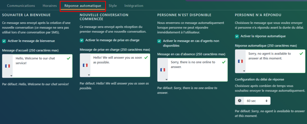 Sélectionnez l’onglet Réponse automatique dans les paramètres de chat: