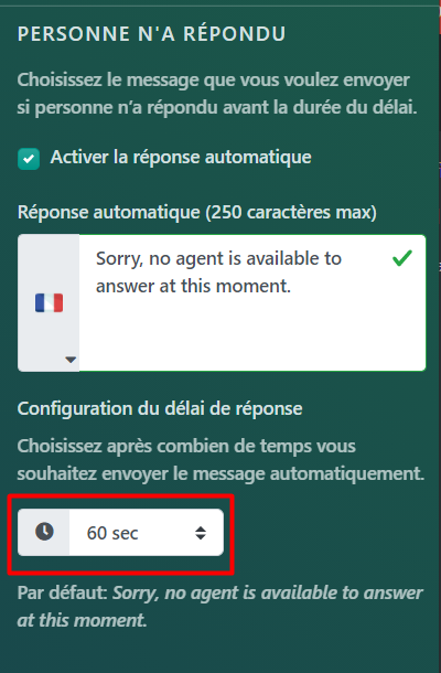 Enfin, pour le scénario « Personne n’a répondu », vous pouvez configurer un temps de réponse, c’est-à-dire le temps qu’il faut avant d’envoyer le message. Vous pouvez ajuster cette heure dans la section « Personne n’a répondu », en cliquant sur le menu déroulant de l’heure:
