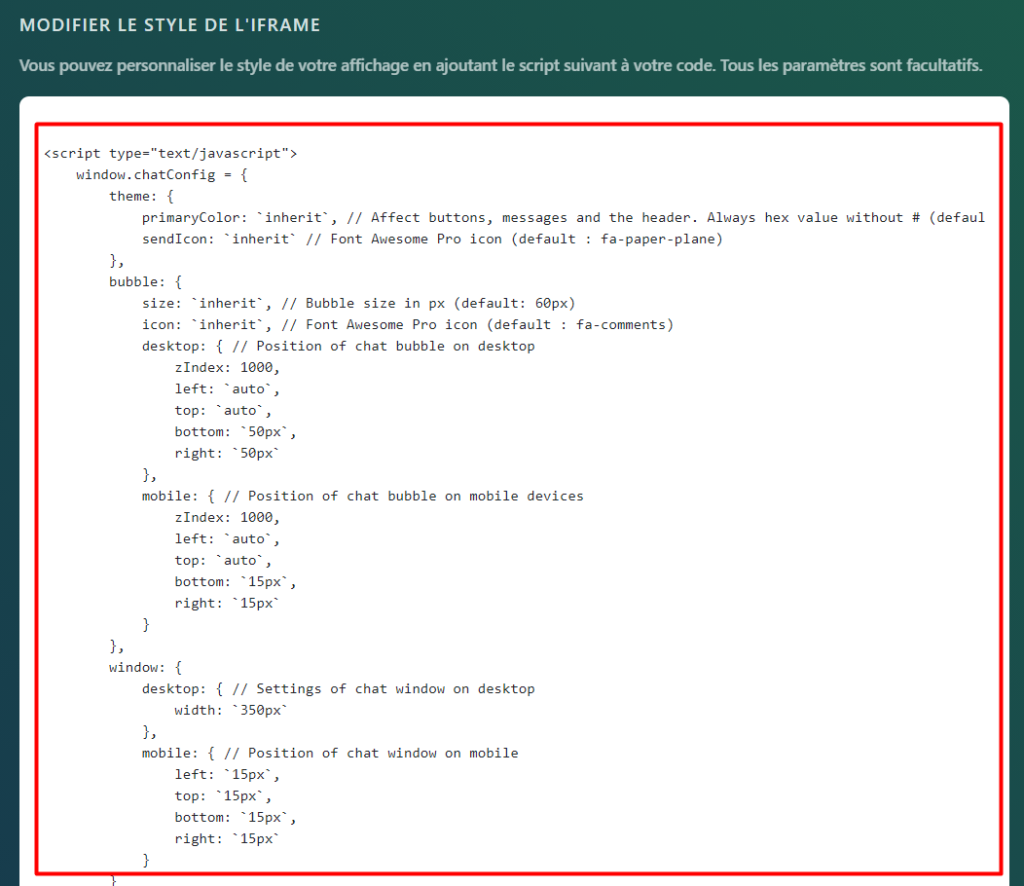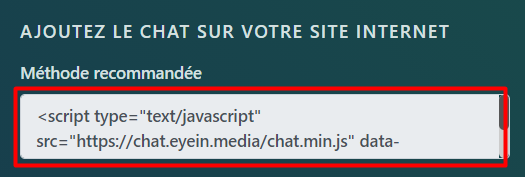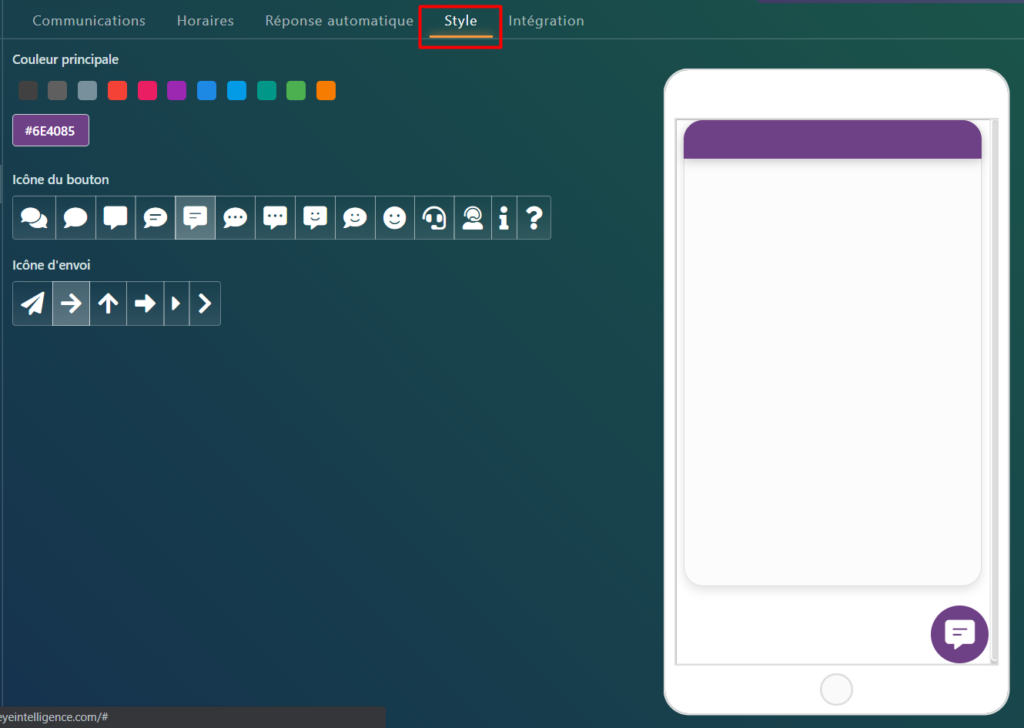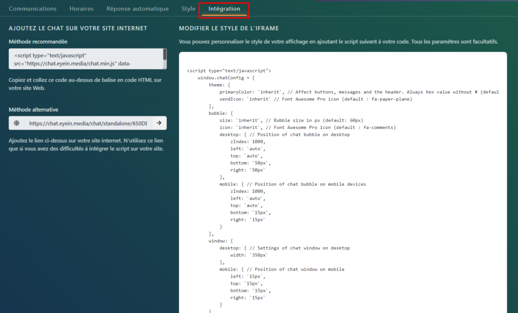 Sélectionnez l’onglet Intégration dans les paramètres de chat: