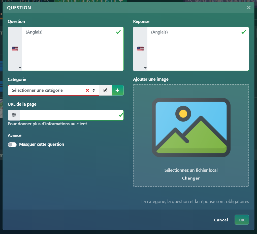 Au minimum, vous devez remplir la question, la réponse et la catégorie pour créer une nouvelle question.