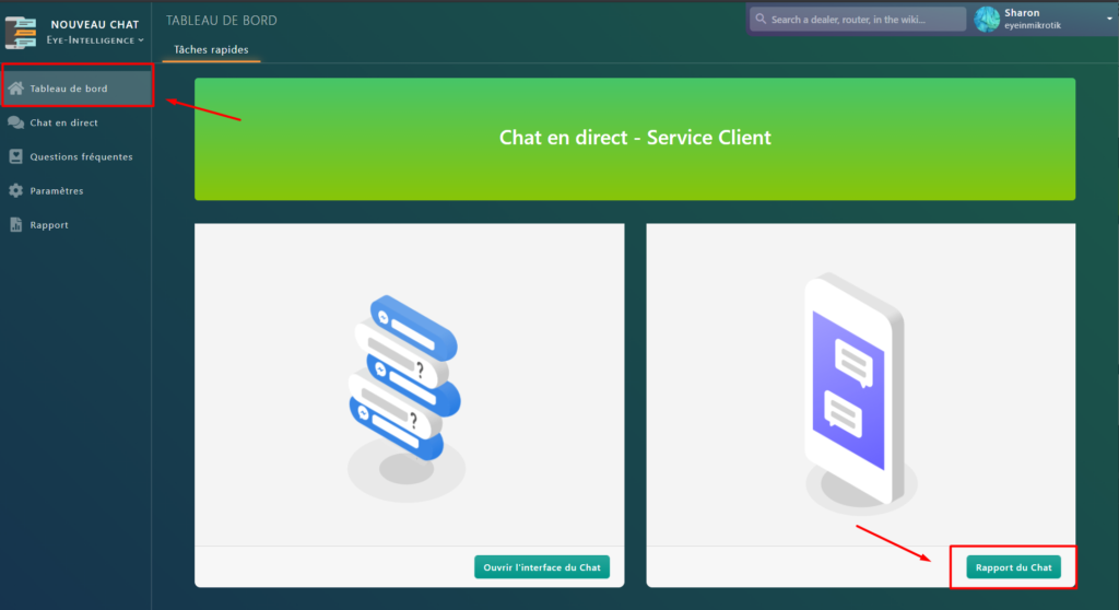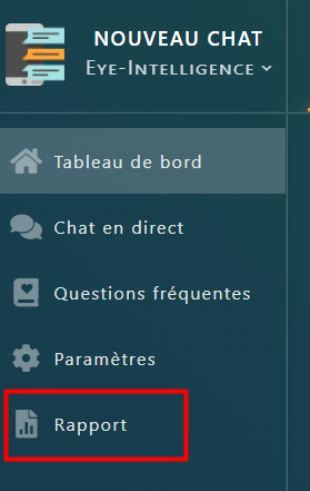Vous pouvez accéder aux rapports via le tableau de bord en cliquant sur « Tableau de bord » dans les options du menu puis sur « Rapport de discussion », ou en sélectionnant « Rapport » dans les options du menu.