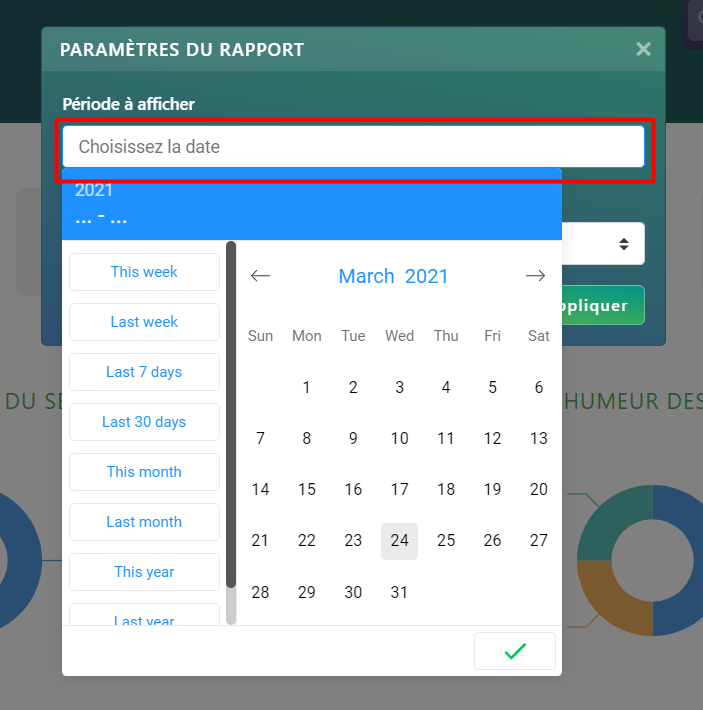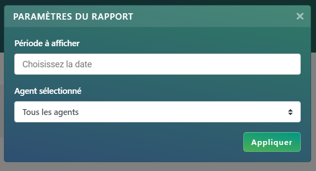 Vous pouvez générer des rapports survenus pendant une certaine période de temps ou afficher les rapports de certains agents à l’aide de l’icône de calendrier dans le coin supérieur gauche: