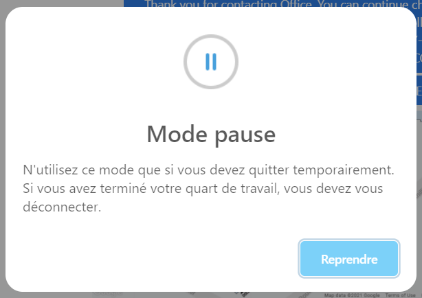 Cette fonction est utilisée lorsque l’agent a une pause temporaire pendant son quart de travail et souhaite mettre en pause son travail sur l’interface de chat.