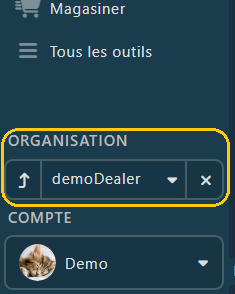 Eye-Intelligence permet à un seul utilisateur de gérer un ou plusieurs sites. Un site par défaut est attribué à chaque utilisateur. Pour modifier l’emplacement que vous consultez actuellement, vous pouvez utiliser le menu déroulant « Organisation » situé au dessus de votre compte. Si vous ne voyez pas ce menu déroulant, cela signifie que votre compte ne vous donne accès qu’à une seule organisation.