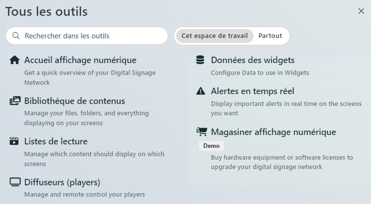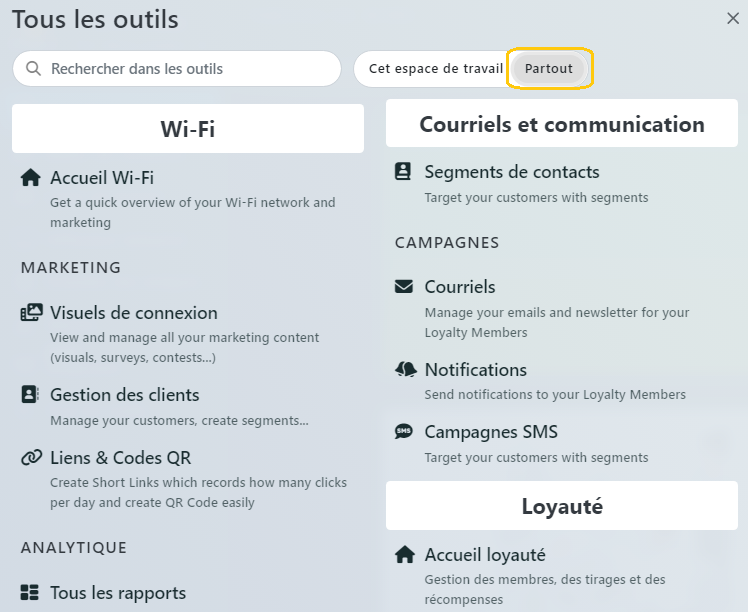 Par défaut, il n’affiche que les options de l’espace de travail actuel, mais vous pouvez utiliser l’option ‘Partout’ pour afficher tous les outils disponibles pour votre compte, quel que soit l’espace de travail.