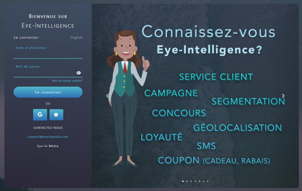 Connectez-vous avec votre Nom d’utilisateur (le plus souvent il s’agit de votre addresse courriel) et votre mot de passe fourni au préalable par Eye-In Média.