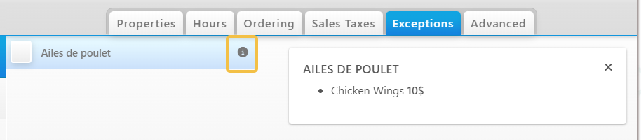 You can click on the Info icon to have a recap of how the exception will affect the menu.