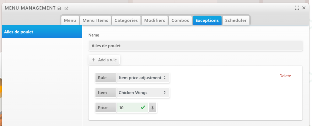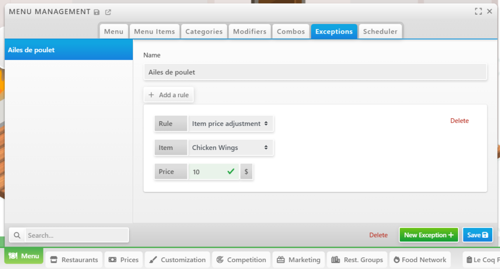 Exceptions can be created or edited in the Menu Management > Exceptions