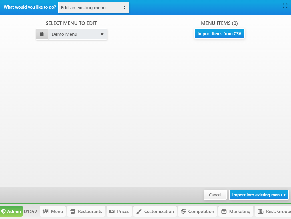 When creating a new Menu, you can click on the blue button Import items from CSV.