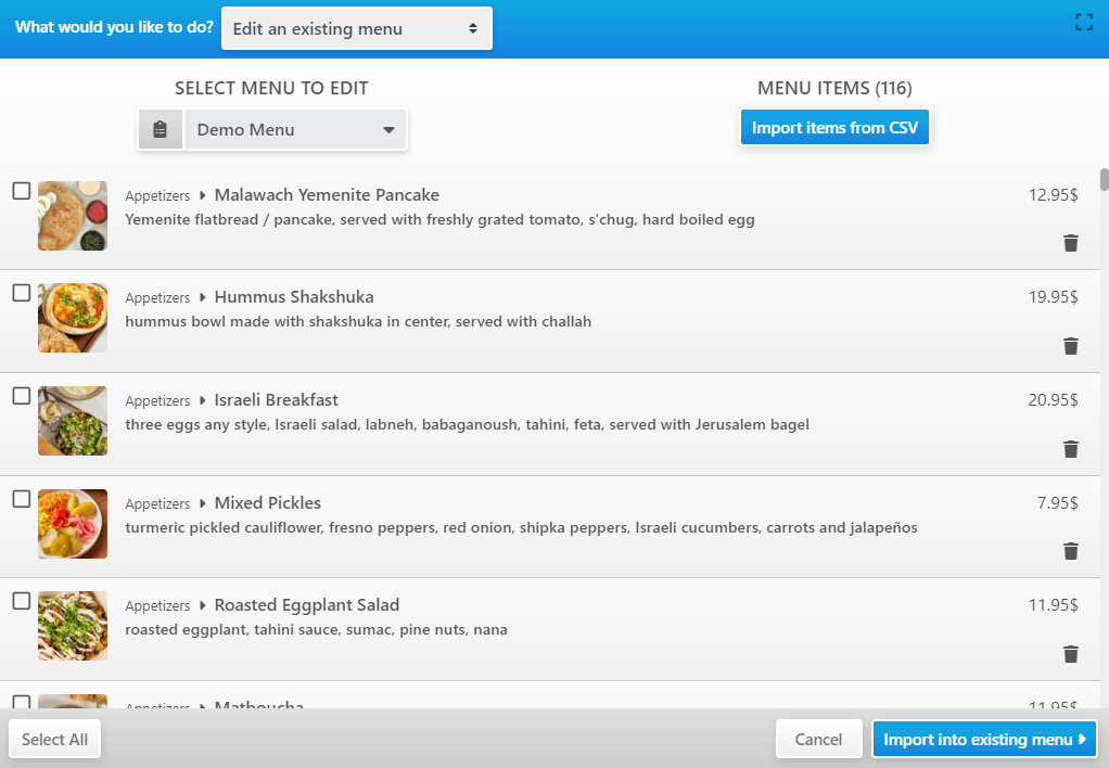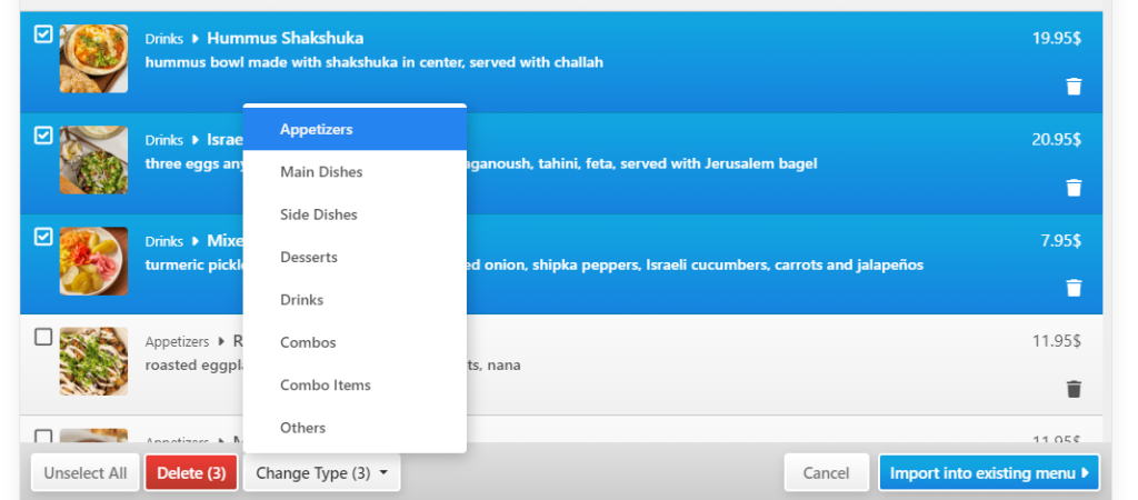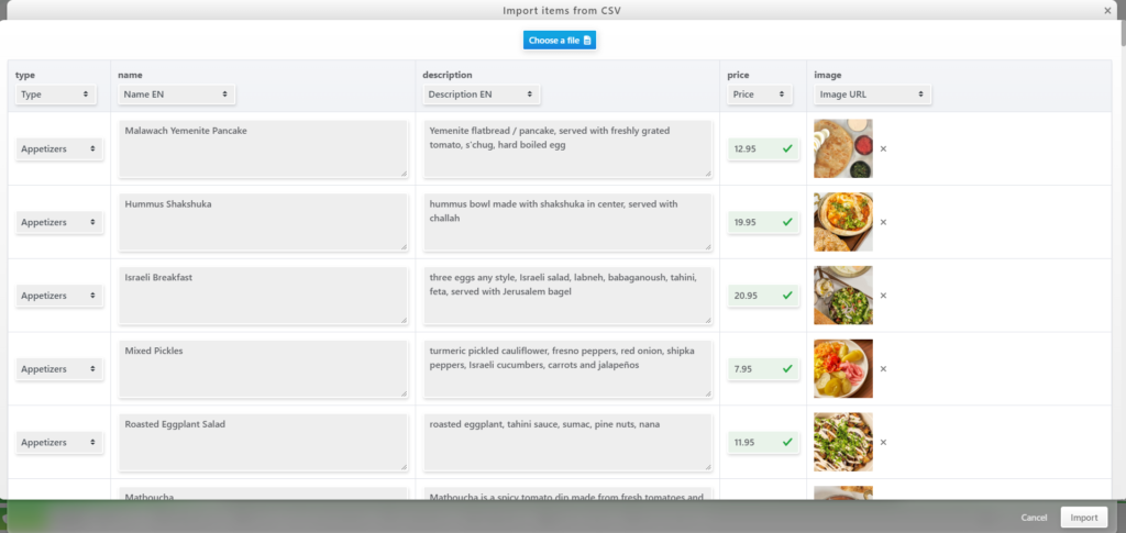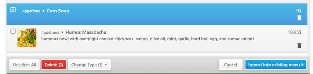 Before Importing Items to your Menu, we offer a special interface to review all items and to quickly fix or remove some of them.