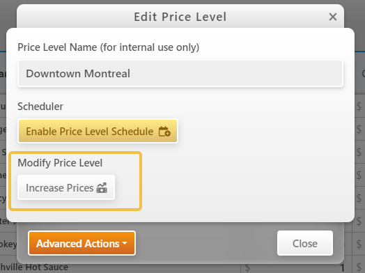 Advanced Features are accessible via the Edit Price Level Modal. Click on the Price Level Column Header to bring the popup on the screen.