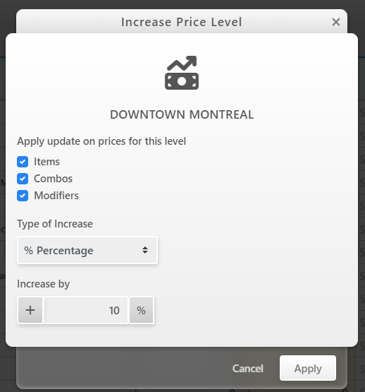 You can increase all Prices for one particular Price Level by a specific amount or percentage. Note that this can also be used to lower the prices if you want.