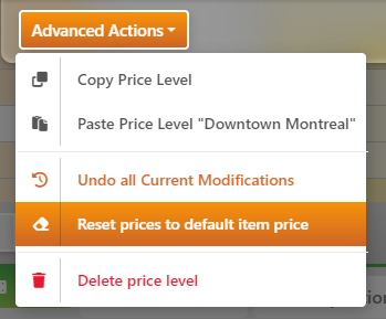 In the Advanced Actions menu, select the option to Reset prices to default item price. This will only affect the Price Level selected.