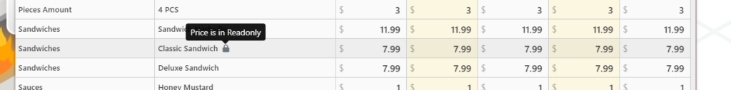 In some rare cases, Prices might be in Readonly state. This will be clearly stated by a lock and the line will be always grayed out. The readonly state is used by admin to make sure nobody will change one price that can’t be modified. They still appear in the list for information only.