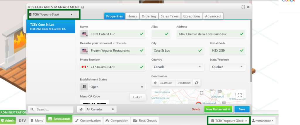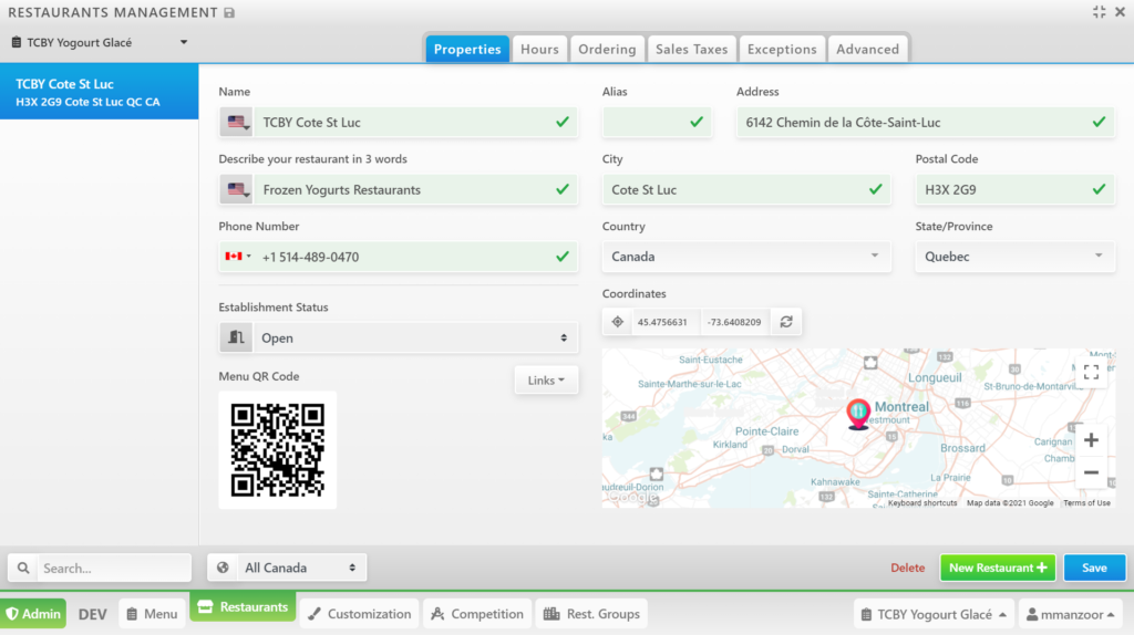 Restaurants can change specific Properties (as listed below). It is also possible to create/delete a new restaurant. Click Save to finalize options.