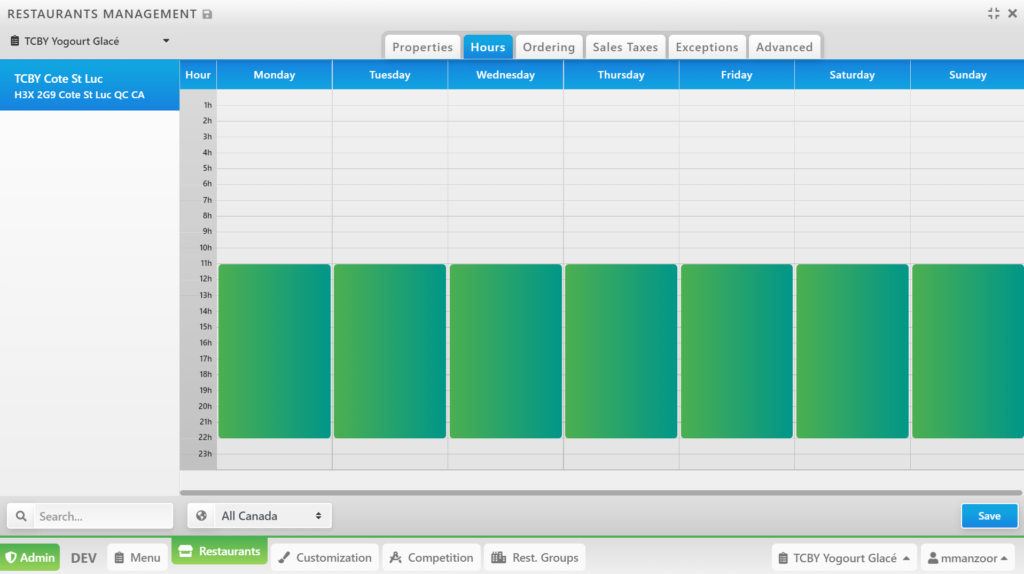 The restaurant has the ability to change their working hours via the Hour tab. Click and drag the hours that the restaurant is open. To indicate that the restaurant is open for 24 hours, click on the day. Click Save to finalize options.