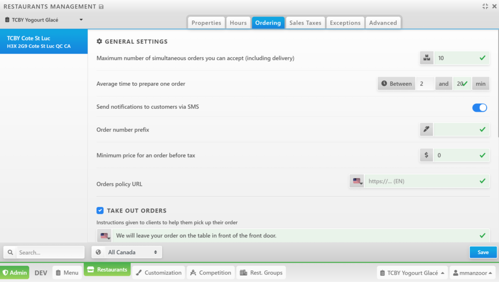 The restaurant can change their general settings (as listed below) for their orders. Click Save to finalize options.