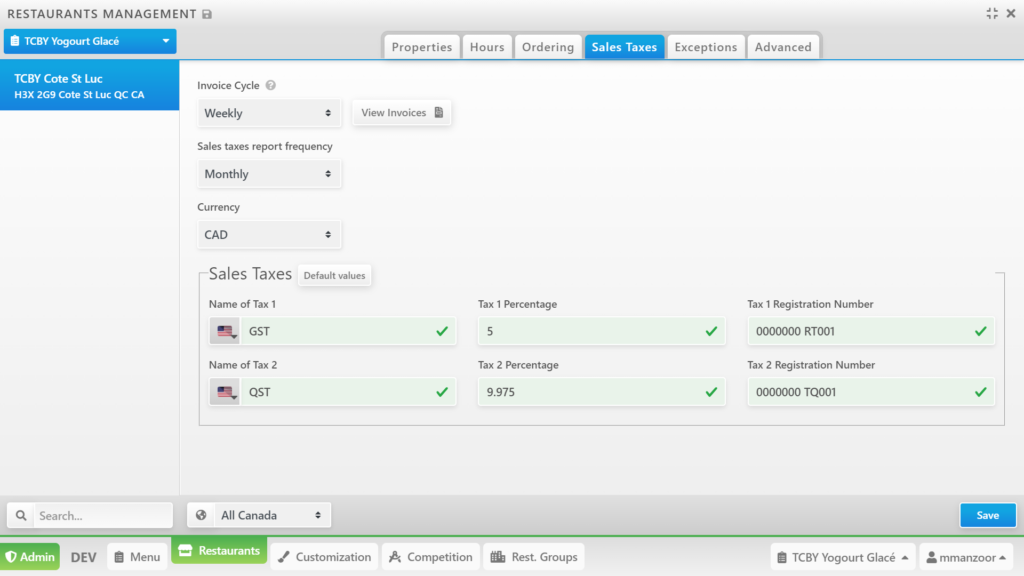 The restaurant can change details concerning the sales tax (as listed below) and view invoices. Click Save to finalize options.