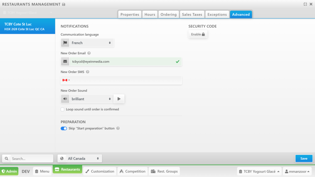 Advanced settings allow the restaurant to change the details of notifications (as listed below). Click Save to finalize options.