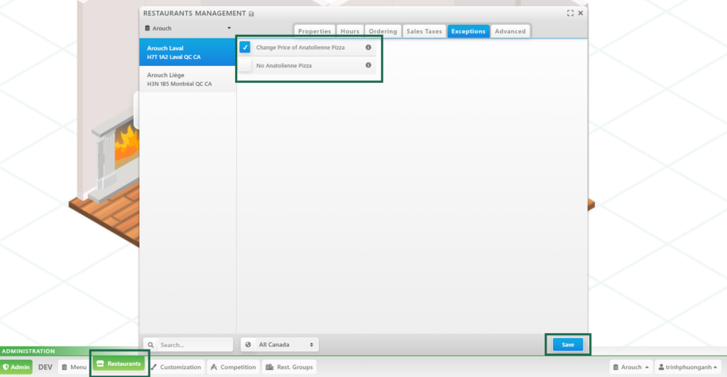The restaurant can set Exceptions that allow customization of the restaurant’s menu.
