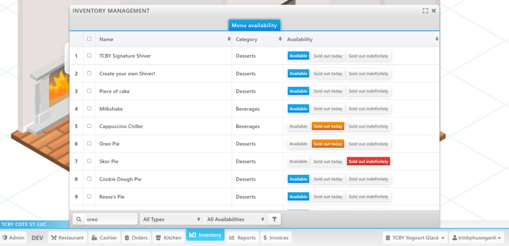 Items can be found faster through the search tab (by item’s name), and filter tab (by types/categories and availabilities [all availabilities/available only/sold out today/sold out indefinitely]).