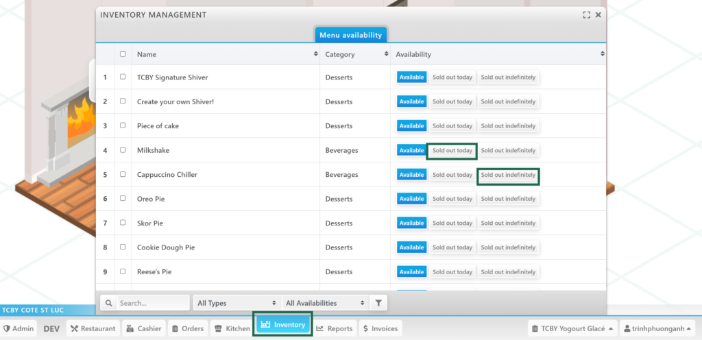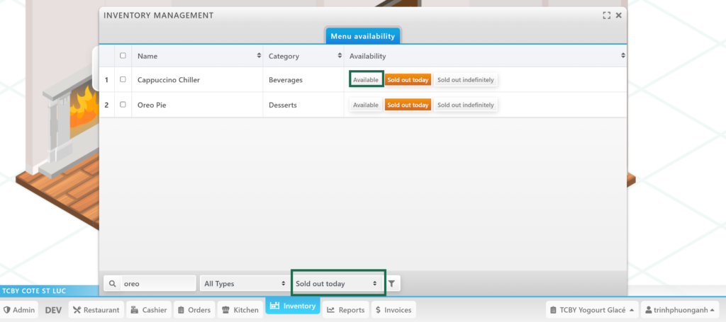 To mark items as Out of Stock, click Inventory -> find the item -> choose Sold out today or Sold out indefinitely.