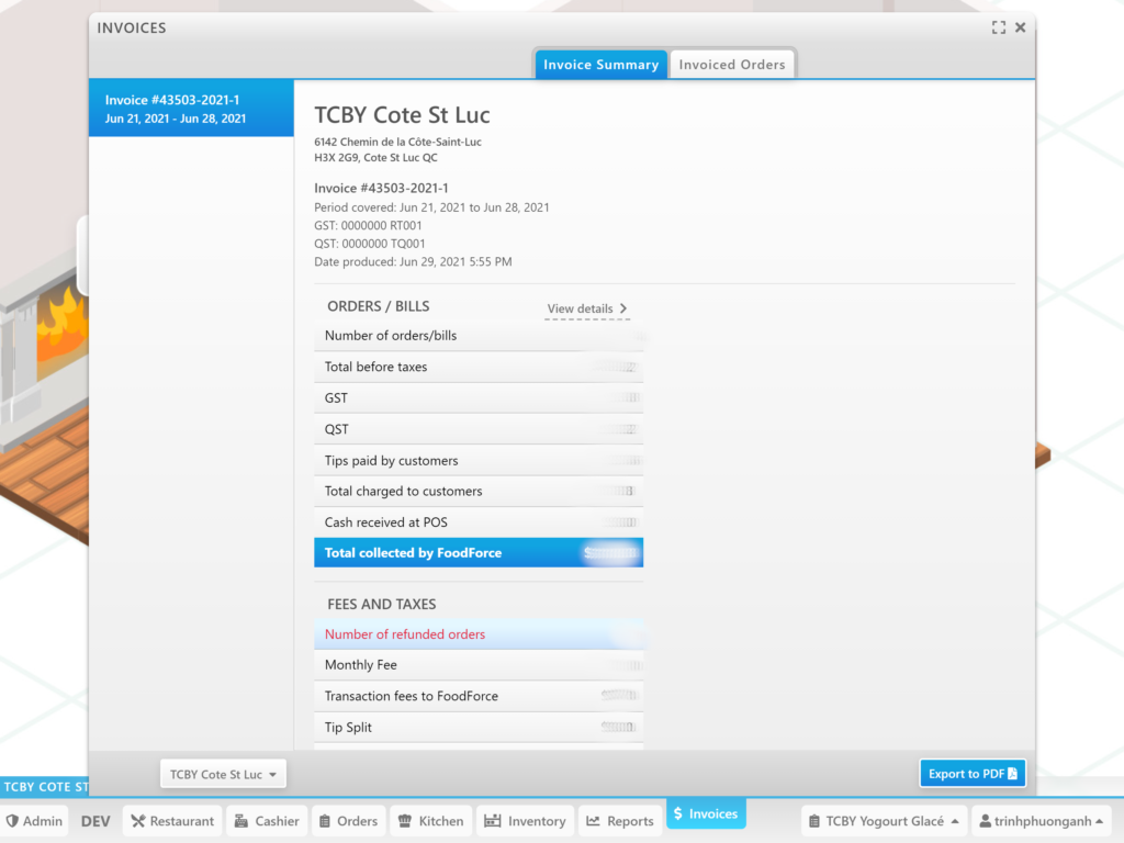 To see any billing and invoices, click Invoices. There is information about the money the restaurant earns as well as the restaurant needs to pay to The Food Force. It can be exported to PDF if needed.