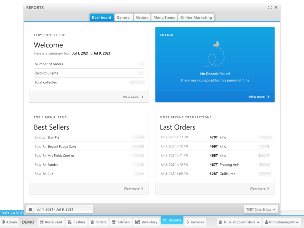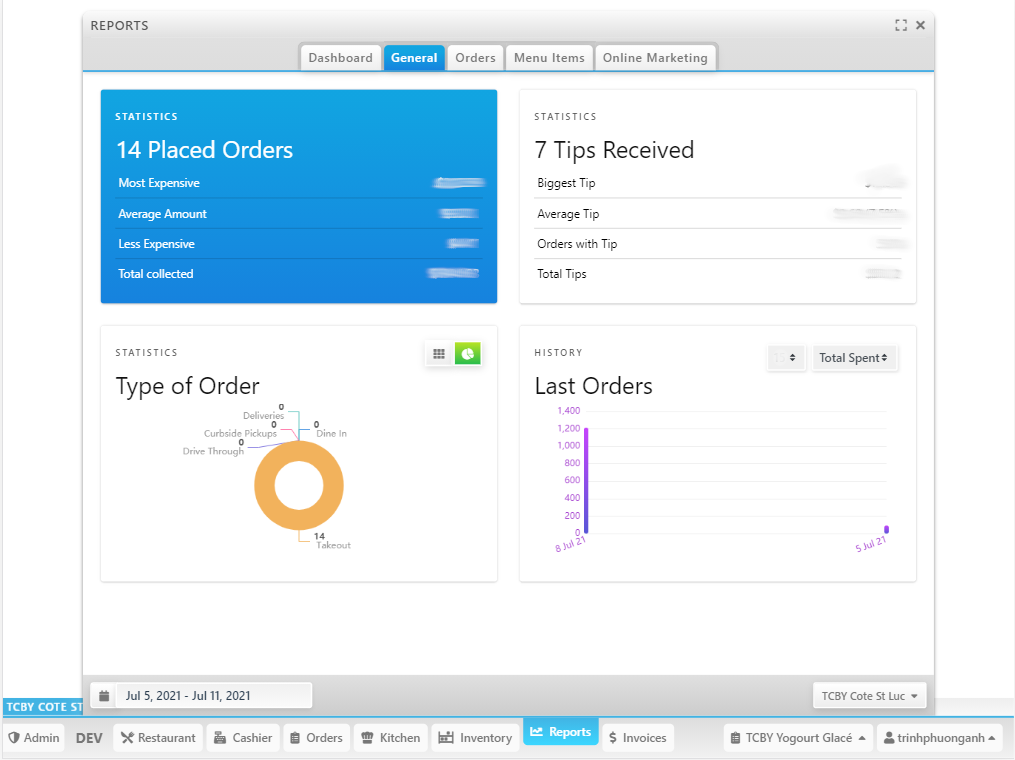 General tab is the statistics of restaurants’ sale. Restaurant could see:
