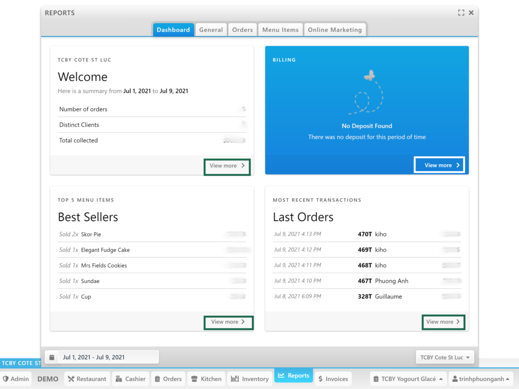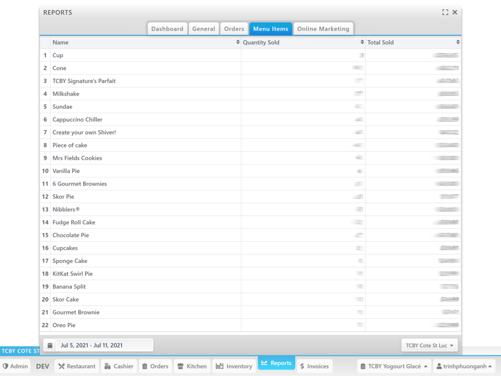 To see which items are sold as well as their sold quantity and how much money spent from them, click Menu Items tab.