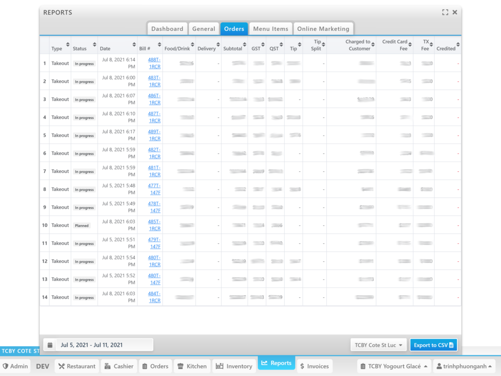Orders tab is where to see all the details of orders in the form of a table that can be exported to CSV file.
