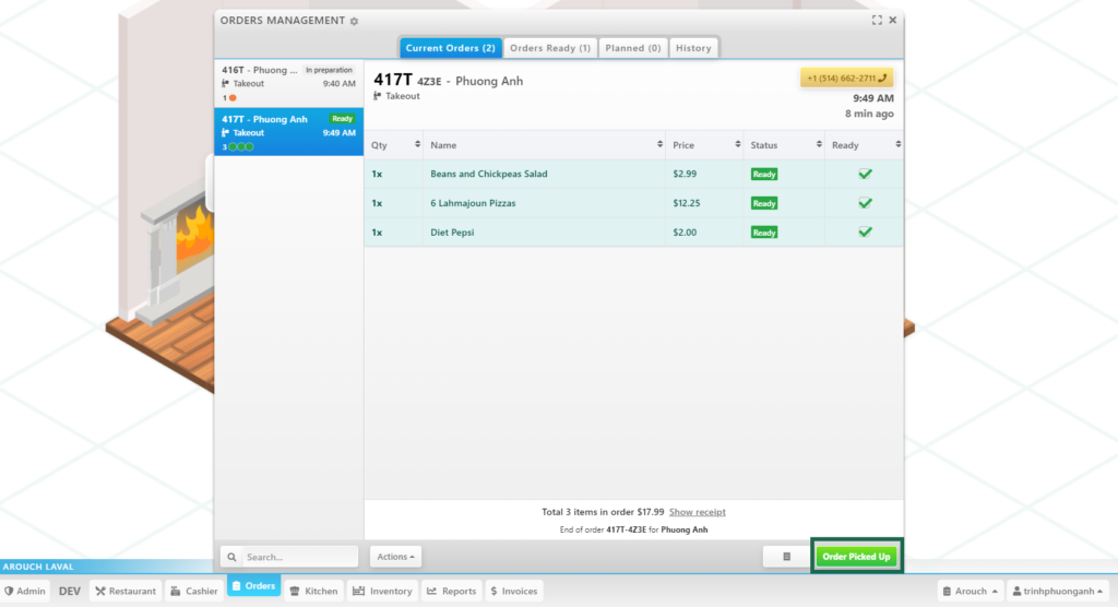 Click Order Picked Up button to confirm that the order was picked up by customers.