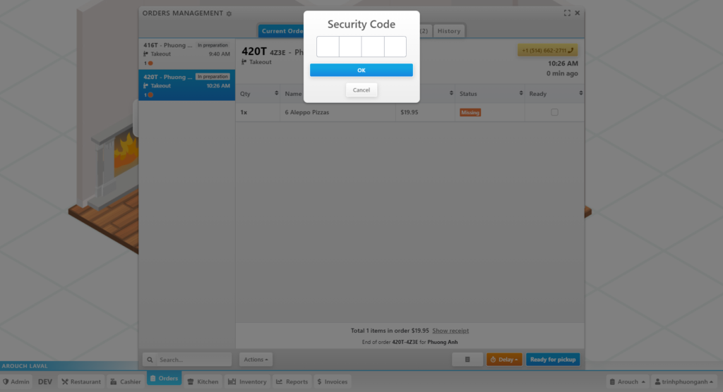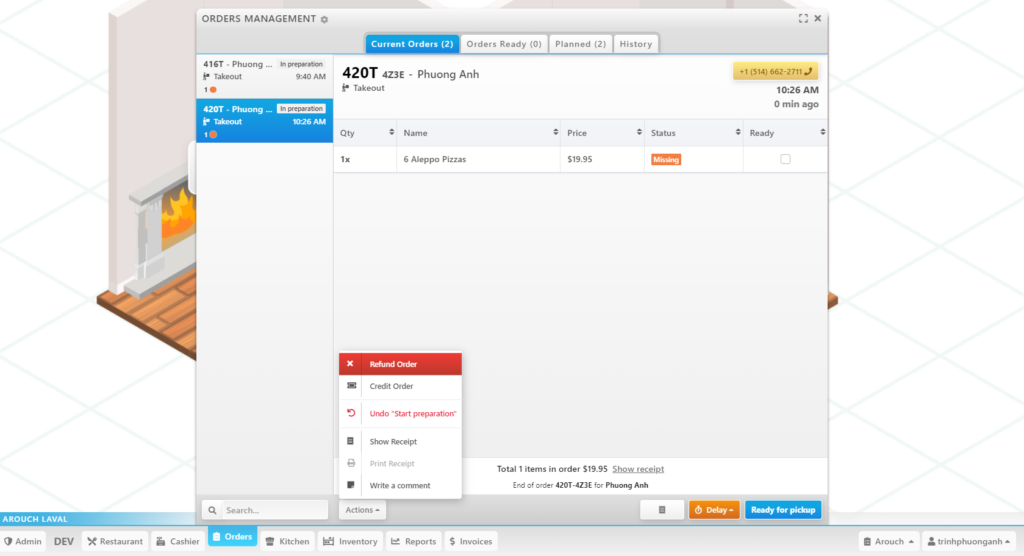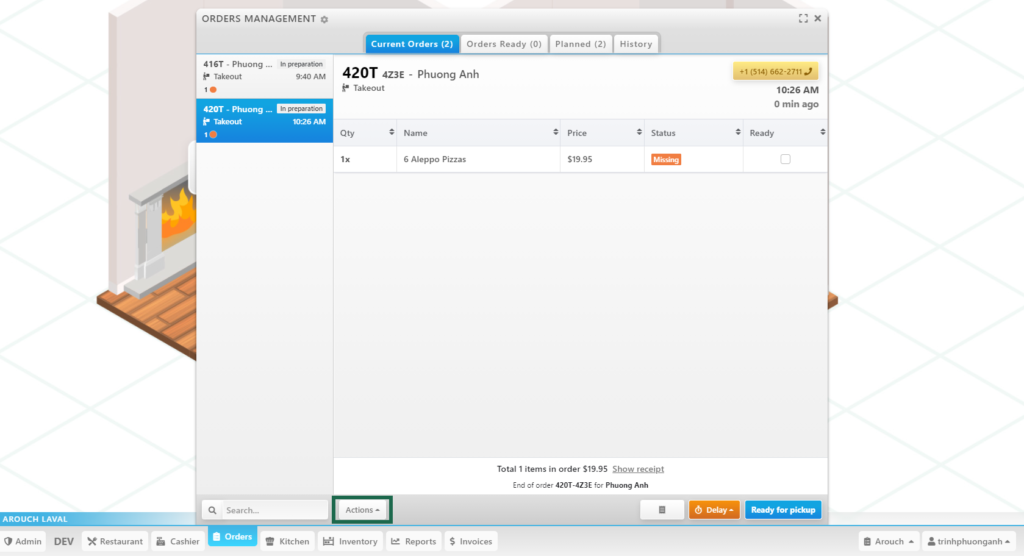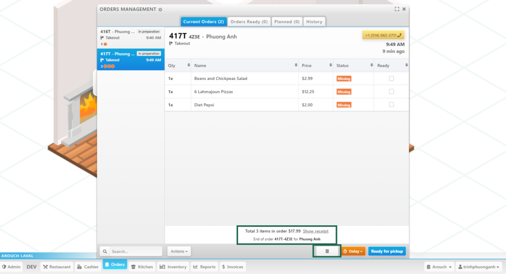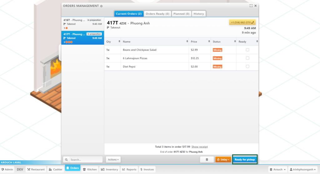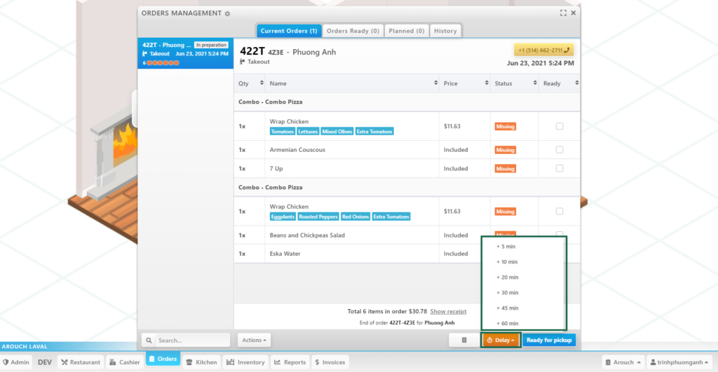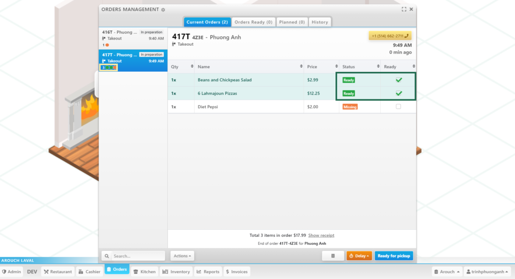 If any items in an order are done, there are boxes that can be checked to make it easier for the restaurant to track whether what else needs to do for the order. The unchecked boxes have the status Missing and checked ones have the status Ready. If all boxes are checked, click to Ready for pickup, the status will change from In preparation to Ready