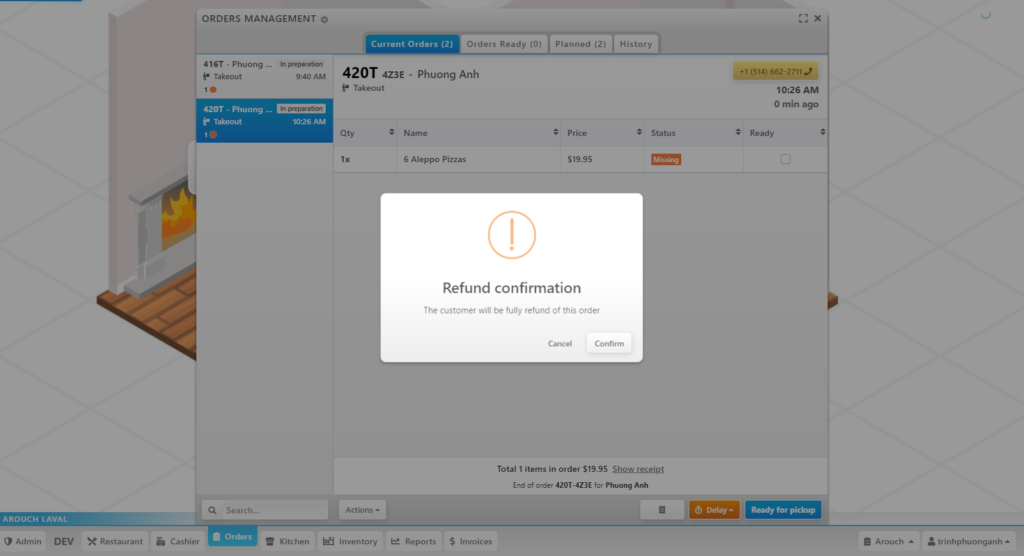 If restaurants have any issues and want to refund orders, choose the desired order -> click Actions -> Refund Order -> Refund confirmation (Confirm or Cancel). If Confirm is clicked, enter Security Code and click OK to refund.