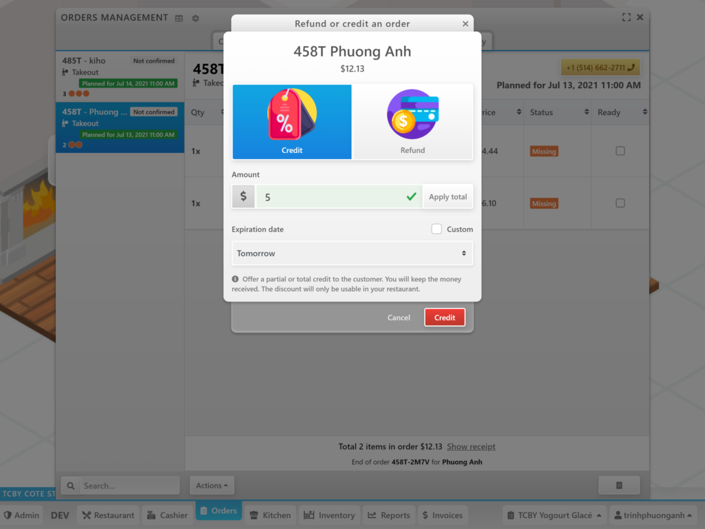 - Click Credit icon -> enter the numbers of credits (or Apply Total) -> choose Expiration Date (can be customized through calendar by checking Custom box, then Select Date) -> Credit