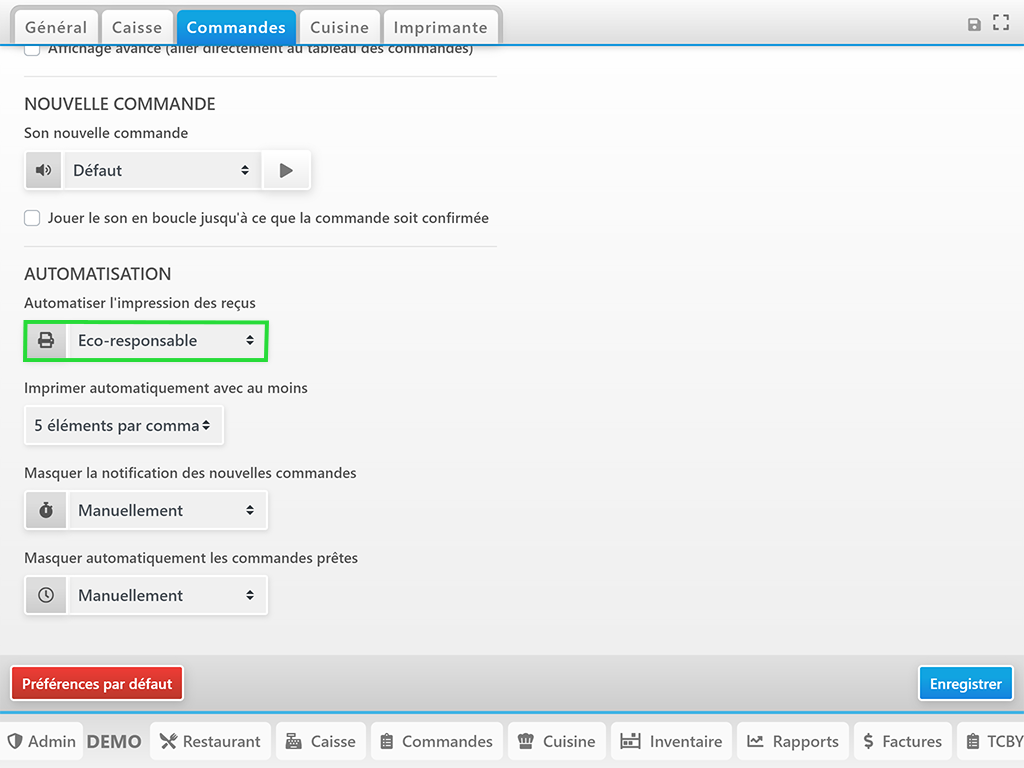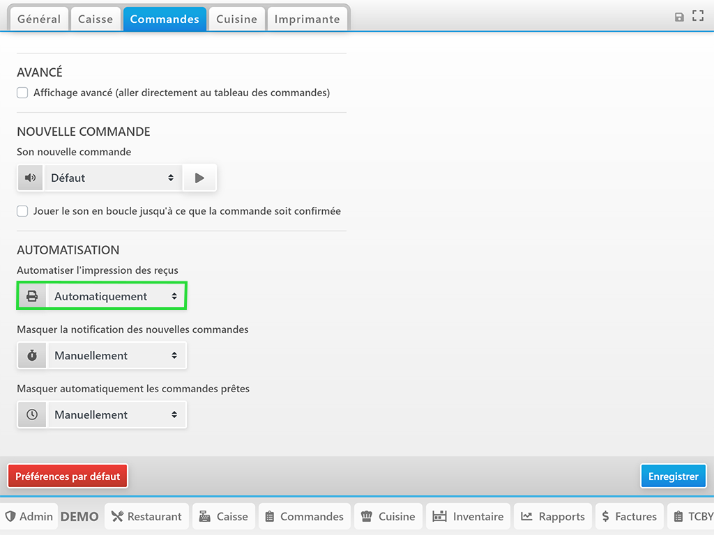 Lorsque cette option est sélectionnée, les reçus s’impriment automatiquement dès qu’il y a une nouvelle commande (écran vert avec son).