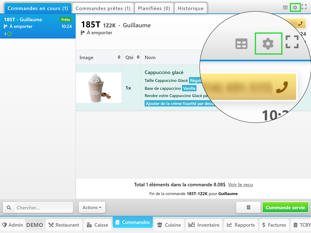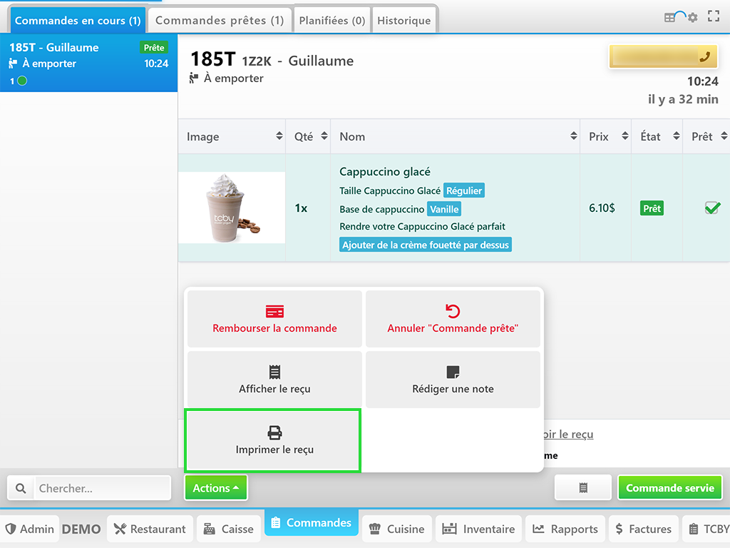 Pour imprimer la commande sélectionnée, il faut cliquer sur Actions ➔ Imprimer le reçu.
