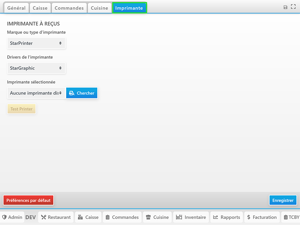 Avant d’imprimer les reçus, il faut d’abord configurer l’imprimante. Pour ce faire, il faut accéder aux Préférences en cliquant sur le petit engrenage en haut.