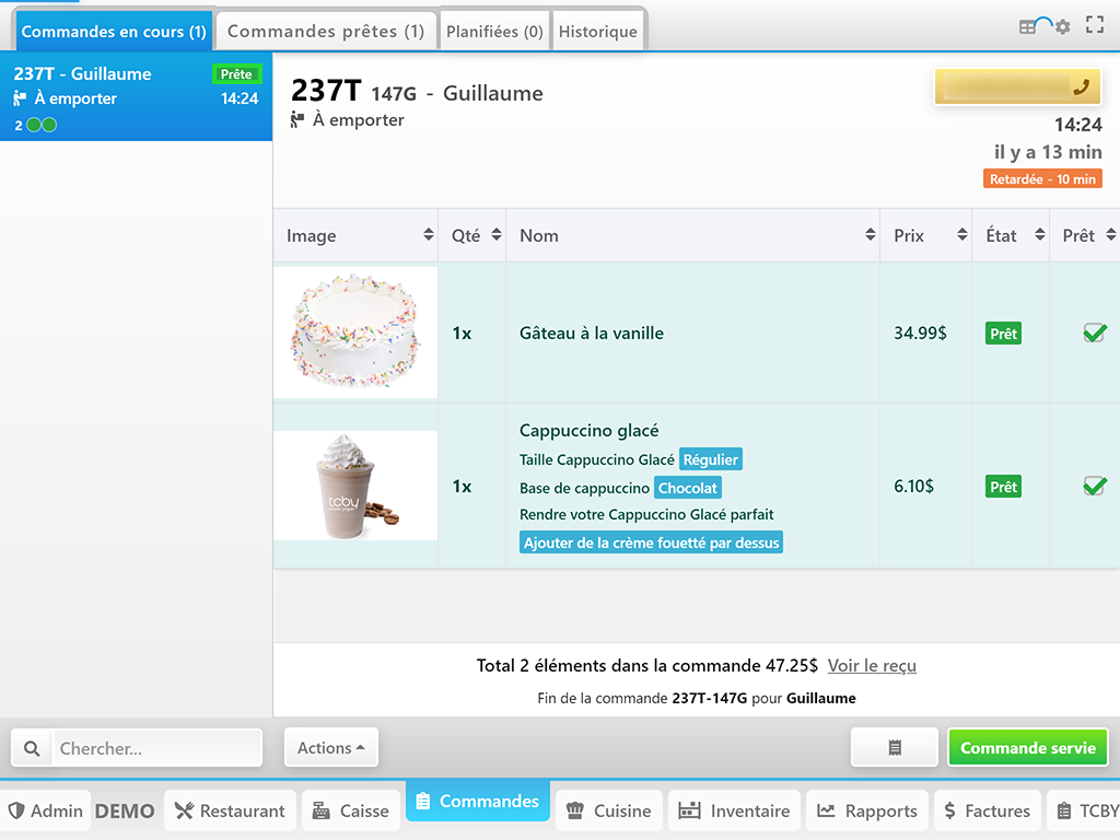 Finalement, lorsque le client est venu chercher sa commande, on peut cliquer sur le bouton Commande servie.