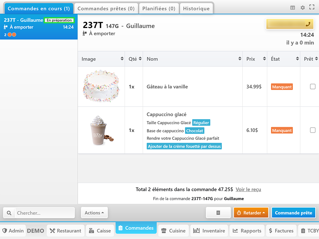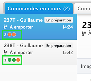 Notez que les deux petits cercles oranges en haut à gauche indiquent l’état des éléments de la commande, ici Manquant. Ils deviendront vert quand l’état sera Prêt. Le chiffre indique la quantité d’élément dans la commande.