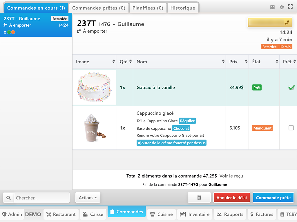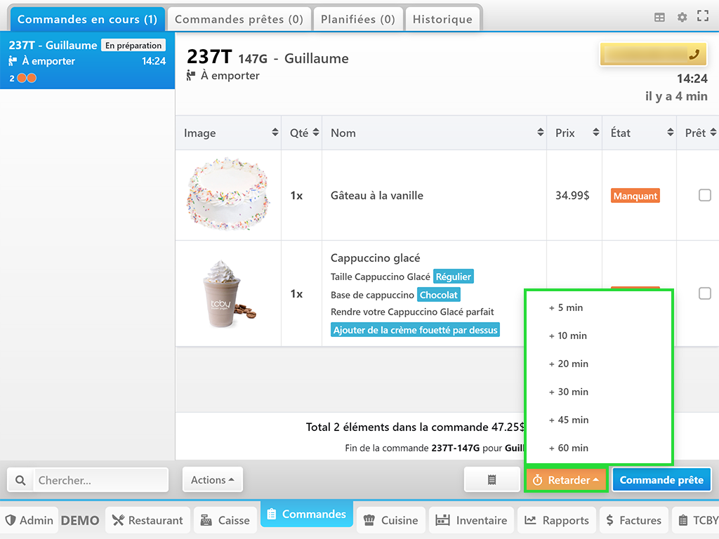 Si le restaurant a besoin de plus de temps pour préparer la commande, on peut toujours ajouter un délai en cliquant sur le bouton Retarder.