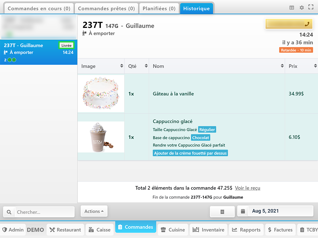 Une fois servie, la commande se retrouve dans l’onglet Historique avec le statut Livrée.