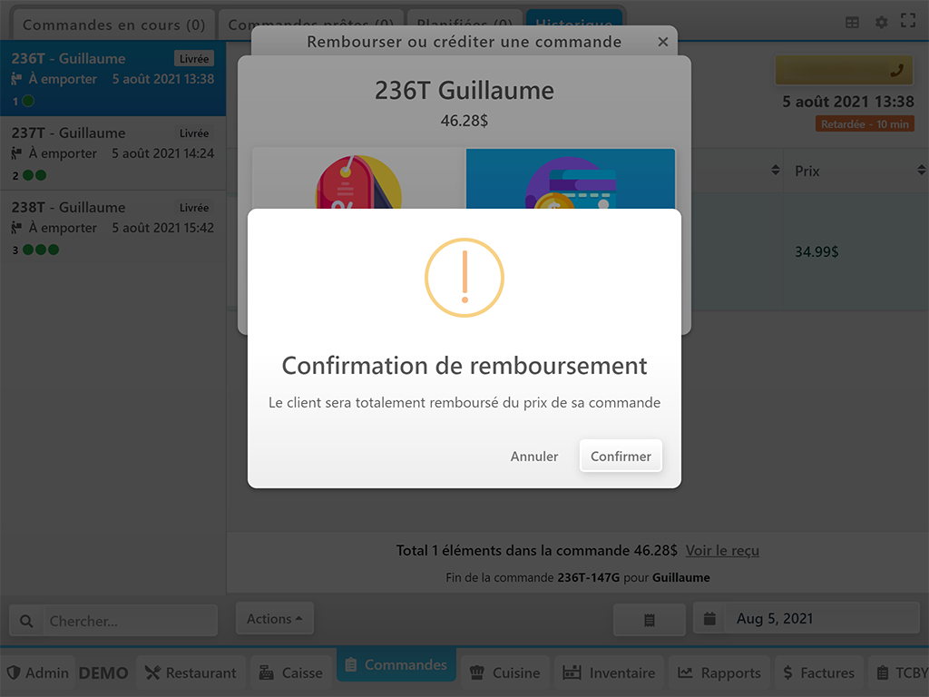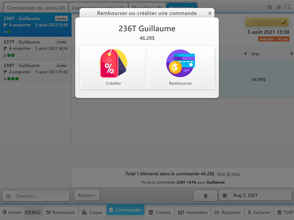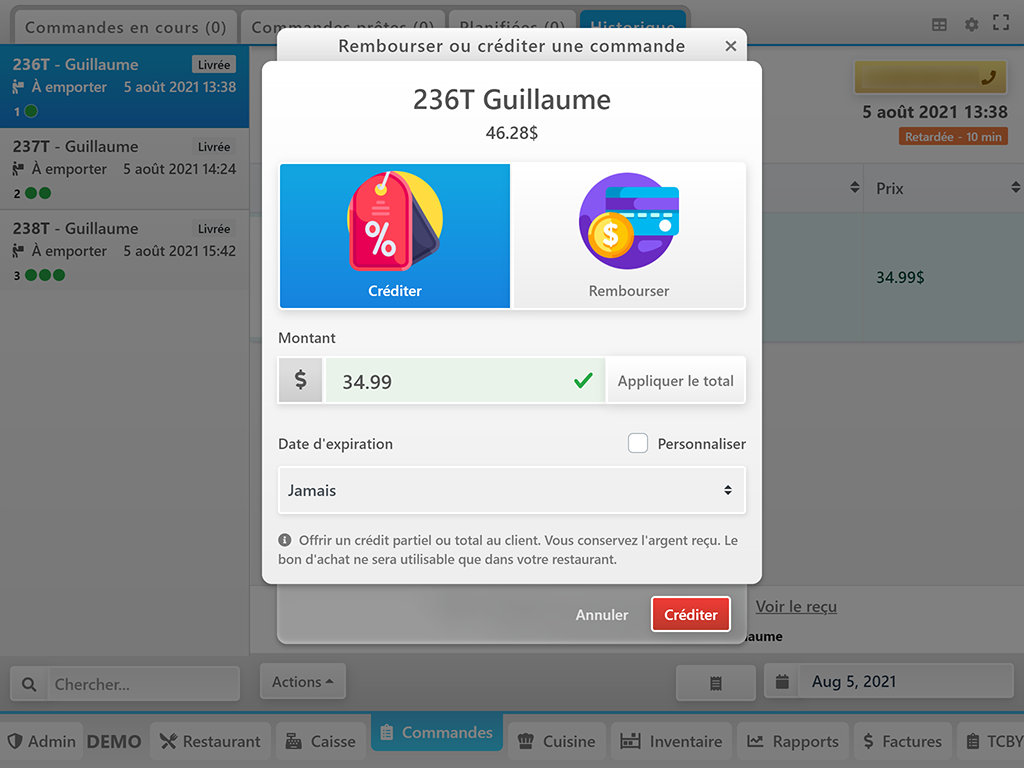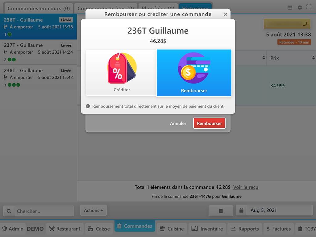 Il existe 2 méthodes de remboursement : Créditer une commande (le restaurant offre un crédit au client à utiliser lors d’une prochaine commande) ou Rembourser l’intégralité de la commande.