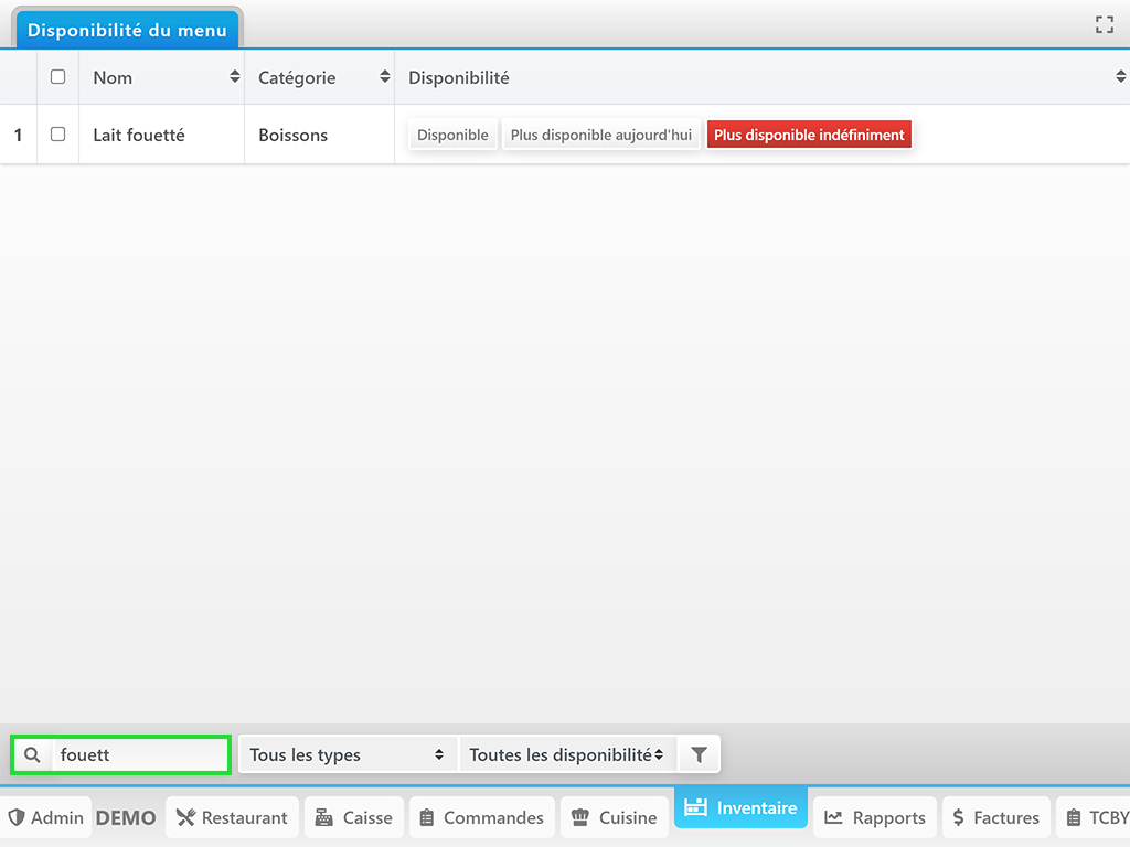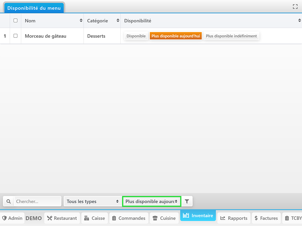 Pour afficher un article en rupture de stock, il faut : Trouver l’élément en question → Cliquer sur Plus disponible aujourd’hui ou Plus disponible indéfiniment.