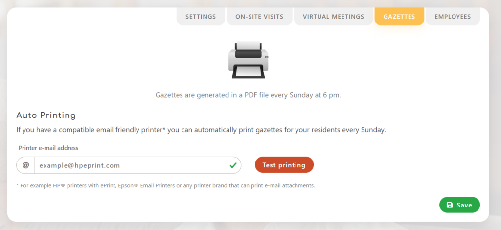 Gazettes may be printed automatically every Sunday at 6 PM. This functionality requires a compatible printer with an email printing capability. Examples include HP’s ePrint printers, or Epson Email printers. Any other printer capable of printing email attachments will work fine.