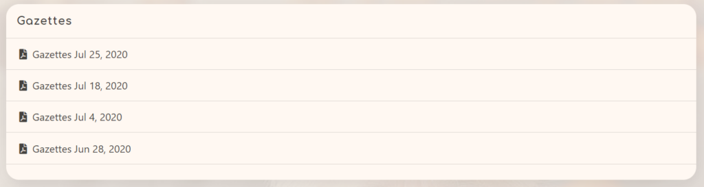 In order to print gazettes for your residents, navigate to the Gazettes page. Once there, you will be presented with a list of gazettes each labelled with the week they correspond to. Simply click on one of them to open a PDF of the gazette which you can then print directly from your browser by opening the print menu or pressing Ctrl + P.