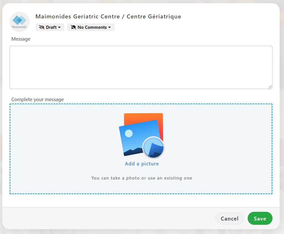 In order to edit a post, simply open the options menu at the top right of a post you’ve created and click « Edit ». This will bring you to the same page shown above, but the post’s current message and image will be displayed. You will now be able to edit the post’s content and save your changes. The options menu of a post will also contain the option to delete it.