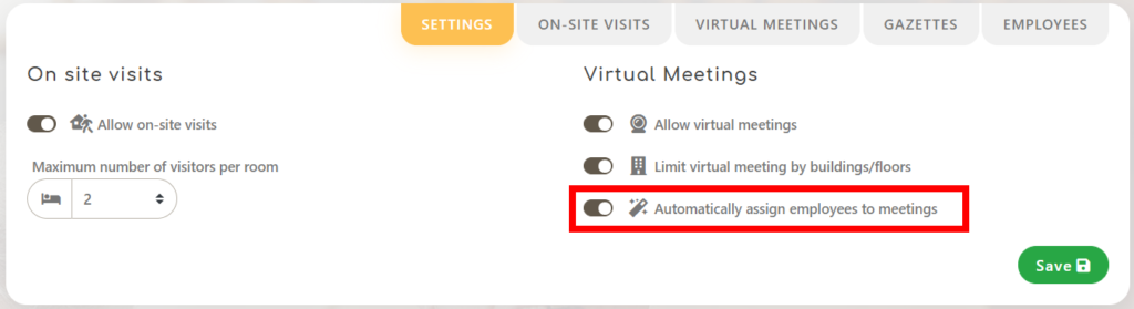 To toggle this behavior, navigate to the Settings page and open the Settings tab. Once there, you will see a section with parameters pertaining to virtual meetings. You may switch the checkbox labelled « Automatically assign employees to meetings » to change this behavior.